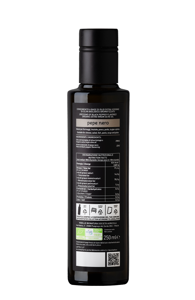 Reserved for connoisseurs of extraordinary flavors, this Black Pepper-Flavored Olive Oil is the secret element to enhance your culinary creations. Add a touch of boldness to your dishes and discover how the pungent aroma of black pepper can transform every bite into a unique gastronomic experience.