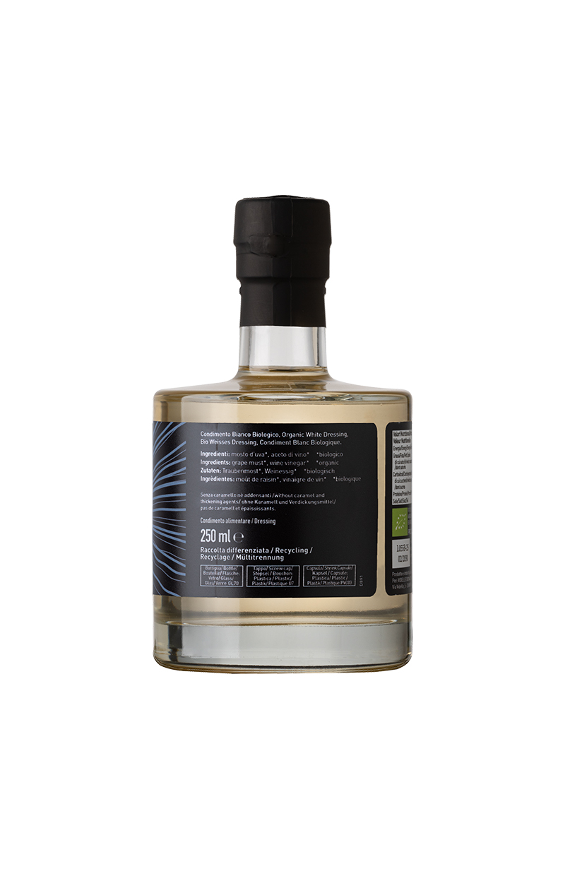 In every drop of this Organic White Balsamic Condiment lies a world of delicate and refined flavors. Obtained from the skillful union of must and vinegar from Trebbiano white grapes, this condiment offers a harmonious and balanced structure that delights the palate with its sweet-and-sour note.